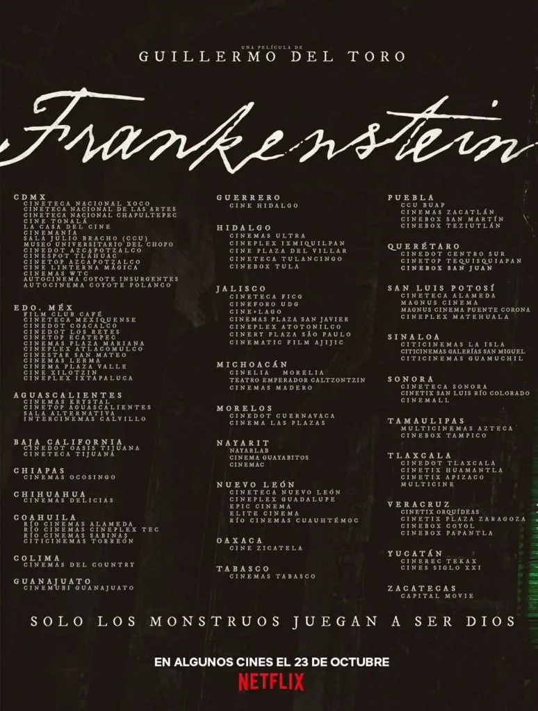 Estos complejos forman parte de la lista nacional de exhibición que incluye más de 60 cines en 30 estados. La película se promociona con la frase “Solo los monstruos juegan a ser Dios”, y representa una de las producciones más esperadas del año, con el sello característico de Del Toro: atmósfera gótica, profundidad emocional y una reflexión sobre el rechazo y la soledad.