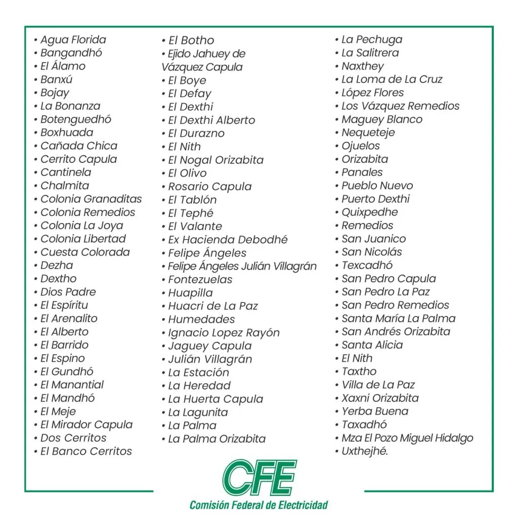 El comunicado detalla un amplio listado de más de 100 localidades que se verán afectadas por el corte programado, entre ellas Agua Florida, Bangandhó, El Álamo, Bojay, Boxhuada, Cantinela, Colonia Remedios, Cuesta Colorada, Dextho, El Alberto, El Espíritu, El Espino, El Mandhó, Dos Cerritos, El Botho, El Dexthí, El Durazno, El Tablón, Felipe Ángeles, Huapilla, Ignacio López Rayón, Julián Villagrán, La Estación, La Huerta Capula, La Palma, La Salitrera, López Flores, Orizabita, Panales, Puerto Dexthí, San Juanico, San Pedro Capula, Santa Alicia, Villa de La Paz, entre muchas otras pertenecientes al municipio.