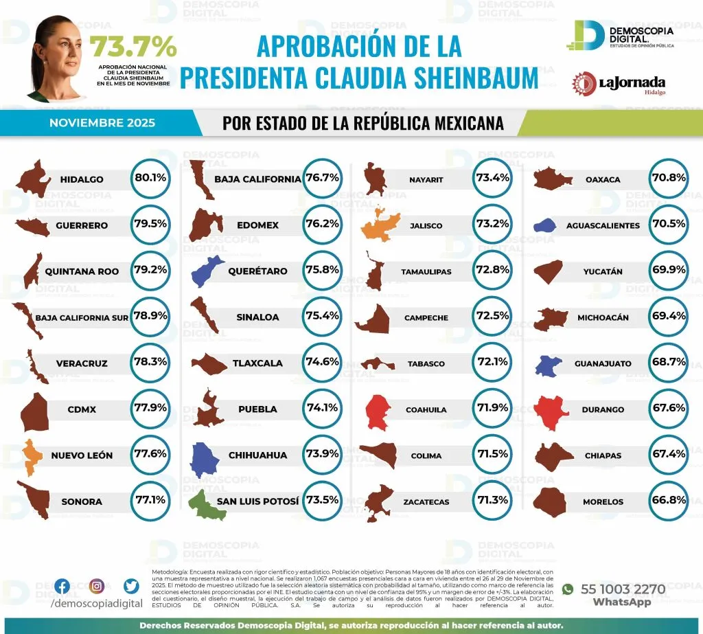 Sheinbaum sube a 73.7% en noviembre y Hidalgo rompe récord con 80.1% de aprobación, según Demoscopia Digital.